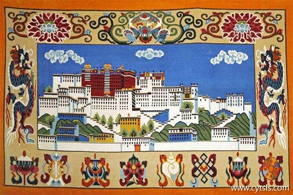 藏毯是世界三大名毯之一,相傳有600年的歷史。西藏地毯織法獨特,色澤鮮艷和諧,毯面柔軟細膩,洗滌不褪色,經(jīng)久耐用,加之具有濃厚民族色彩的圖案花紋,所以也有很高的欣賞收藏價值。藏毯分地毯式的和掛毯式的。拉薩地毯廠和日喀則的藏毯廠是現(xiàn)在生產(chǎn)藏毯的最大的企業(yè),它除了保持原有的手工制作外,還引進了電腦等高科技設備進行制圖設計等工序。但是最有風味的還是老百姓家里自己織的手工藏毯,因為最有特色,而且沒有重樣的。