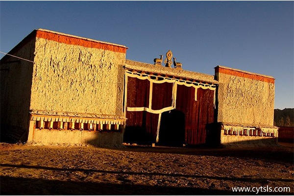 托林寺,意為“飛翔寺”。寺周地勢平坦,原多僧舍,現(xiàn)為民居。寺廟南以土山為屏,北臨朗欽藏布,殿堂、佛塔、塔墻、僧舍如星散布,遠眺氣勢非凡。托林寺原有建筑規(guī)模較大,包括朗巴朗則拉康、拉康嘎波、杜康等三座大殿,巴爾祖拉康、瑪尼拉康、吐幾拉康、乃舉拉康、強巴拉康、貢康、卻巴康等近十座中小殿,以及堪布(寺院住持)私邸、僧舍、經(jīng)堂、佛塔、塔墻等建筑。由于歷史原因,寺院受到不同程度的破壞,保存較好的只有三大殿和一座佛塔。