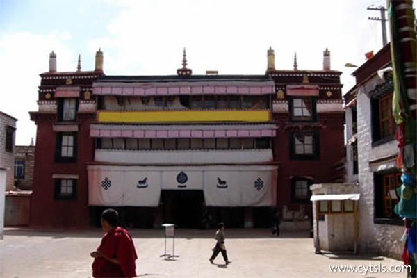 小昭寺,占地面積約4000平方米。其前部為庭院,后部是神殿及其門樓、轉經回廓等附屬設施。門樓高三層:底層為寬敞的明廓。明廓有10根大柱(直徑0.8米),皆為十六棱形。柱身有三條銅箍,銅箍面上透雕花瓣。柱一上半部雕有繁縟的花草紋,柱頭上浮雕寶珠、“回”字紋、花瓣及連續的“六字真言”。前四排大柱的柱栱上浮雕海水云龍紋。明廓后部墻壁上繪有四大金剛(即四大天王)和六道輪回圖(畫面上有一個棕色的兇惡明王抱著一個巨大的車輪,巨齒獠牙銜著輪的上部;大輪分成三層,圓心畫蛇、鳩、豬等,內輪分為六格,即六道,最外層又有十二個畫面,稱“十十緣起支”:即無明、行、識、名色、六處、觸、受、愛、取、有、生、老死)、極樂世界圖等壁畫;門樓二三層是僧房和經堂等。穿過門樓即是繞神殿一周的轉經回廊。回廊南、西、北三面原豎有木制嘛呢輪,廓壁上也遍繪無量壽佛、白度母等壁畫。