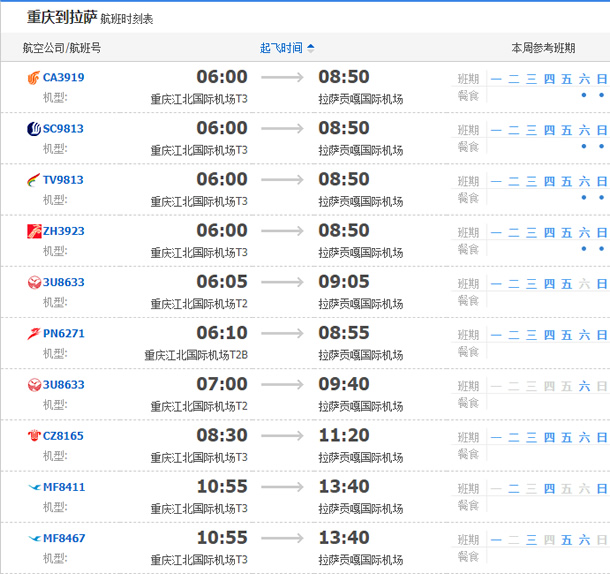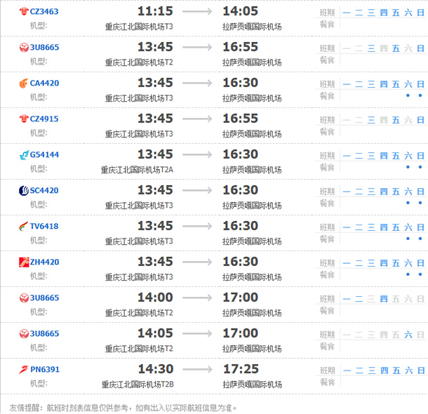 以上就是重慶飛拉薩的航班時(shí)刻表,起飛時(shí)間,到達(dá)時(shí)間,及固定航班日期。