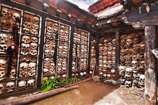 是用近1000多個人的頭顱骨堆砌而成,面積約30平方米,是世界上獨一無二的,可堪稱一絕。黑洞洞的眼窩,吡牙張口。據說只有比較有宗教地位的人,才可以把頭骨放在上面。它是絕無僅有的人類奇觀之一,也成為研究人類喪葬文化的好場所。